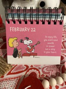 This morning as I flipped to a new page in my Snoopy calendar, I was filled with a moment of joy to see that it was based exactly on what I had woken up dwelling on. Joy? In spite of anxiety? I’ll include the Snoopy picture at the bottom but he was reminding me that more than wealth or even power, joy comes from a song in the heart.