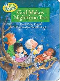 One of my favorite books to read to my smallest ones was this one, God Made Nighttime, Too. It is written in rhyme form and I would gladly read it (sometimes I sang it) to the child each night before bed. It settled them down and they knew it meant bedtime. Perfect for both of us. You can usually find a copy here.