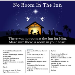 So no room was all part of His plan but what is not part of God’s plan is the world having no room in our hearts for Him. II Peter 3:9 says, “The Lord is not slack concerning his promise, as some men count slackness; but is longsuffering to us-ward, not willing that any should perish, but that all should come to repentance.”