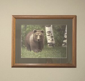 We were sleeping beautifully one night several years ago when we were violently awakened with a loud “CRASH”! I crept out of the bedroom to the family room. There on the floor was our big, beautiful picture of a bear in the wilderness. It had always hung above our fireplace mantel since we obtained it. Now it lay on the floor. Miraculously only the frame was damaged but it was still broken. We had to have it repaired.